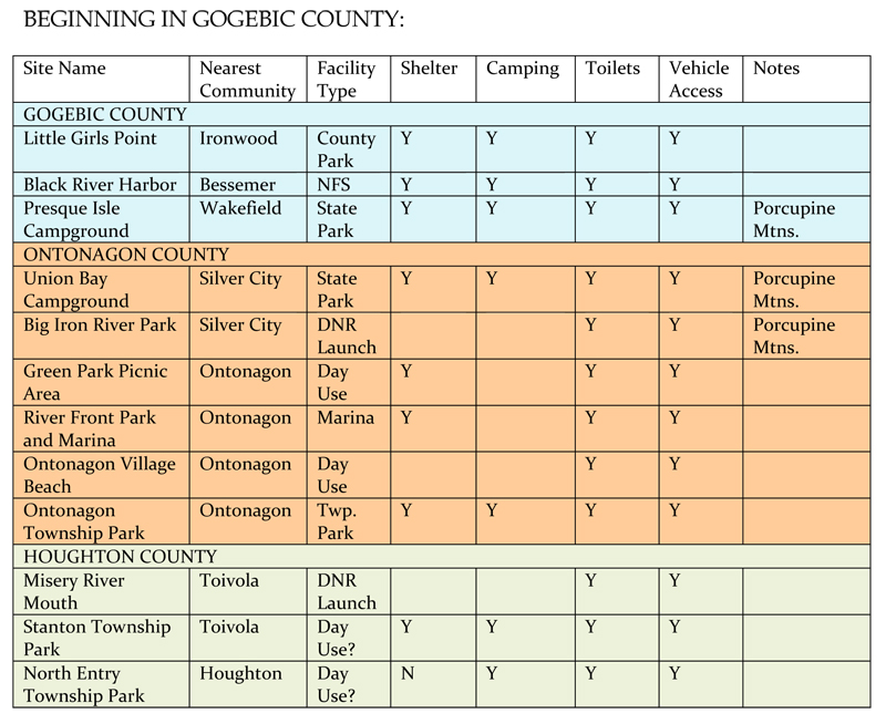 Nearly 100 public access points are scattered throughout the Western Upper Peninsula Water Trail. Access points may be near other facilities such as parks, shelters, camp sites, restrooms and vehicle parking.